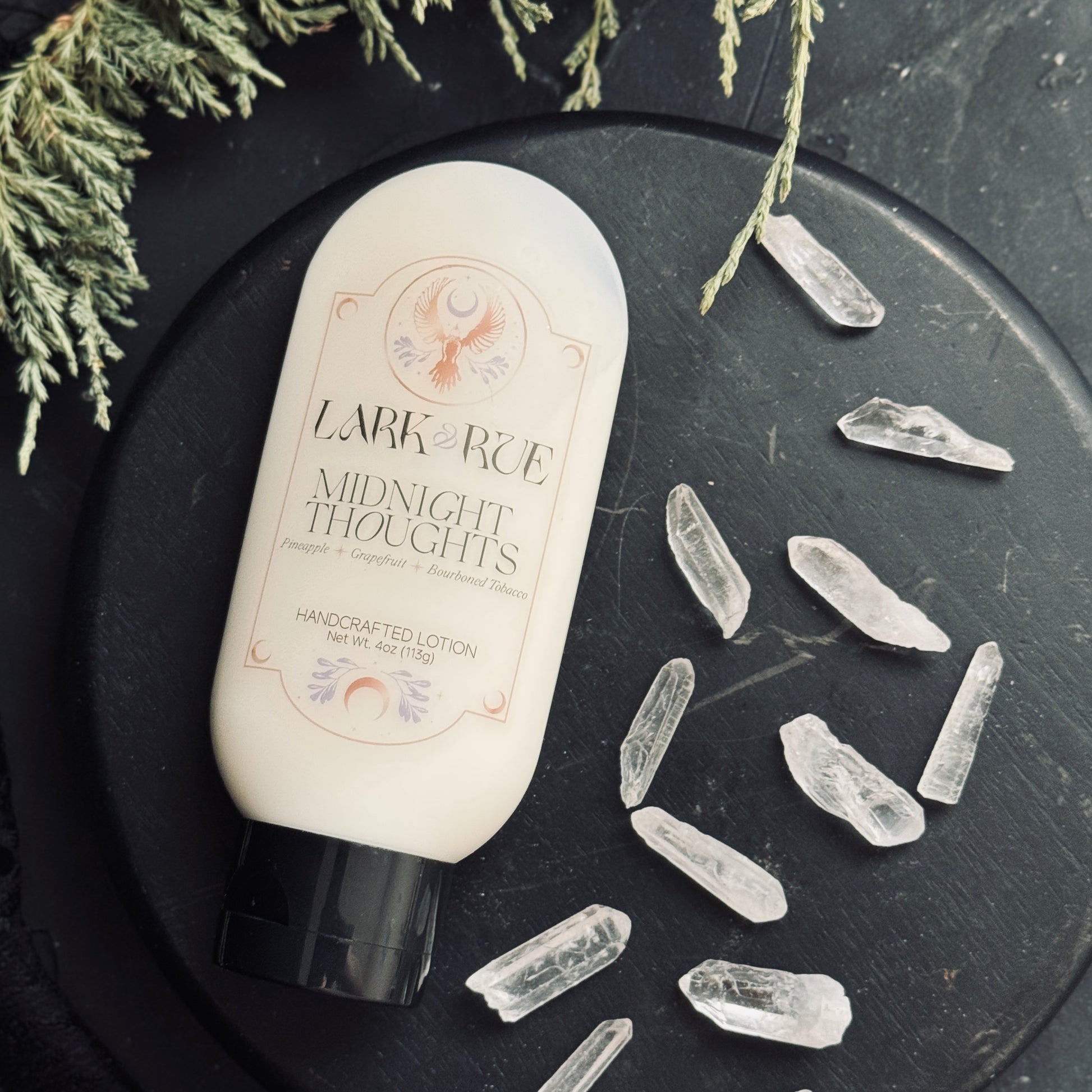 Midnight Thoughts is a reverie captured in a bottle—a bewitching blend of shadowed dreams and quiet contemplation. This handmade-from-scratch lotion entwines the bright allure of pineapple, grapefruit, and orange with the smoldering depths of cedarwood, tobacco, and oak-aged bourbon. Delicate rose petals and the warm embrace of tonka bean complete this intoxicating aroma, like a secret whispered to the night. Let this enigmatic elixir wrap you in a veil of mystery and moonlit indulgence.